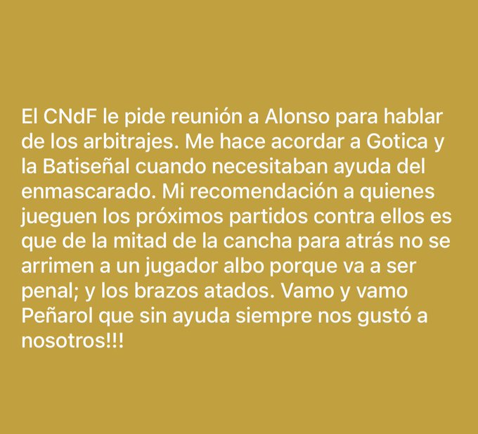 "Mi recomendación a quienes jueguen los próximos partidos contra ellos es que de la mitad de la cancha para atrás no se arrimen a un jugador albo porque va a ser penal; y los brazos atados". "Vamo´ y Vamo´ Peñarol que sin ayuda siempre nos gustó a nosotros", finalizó.