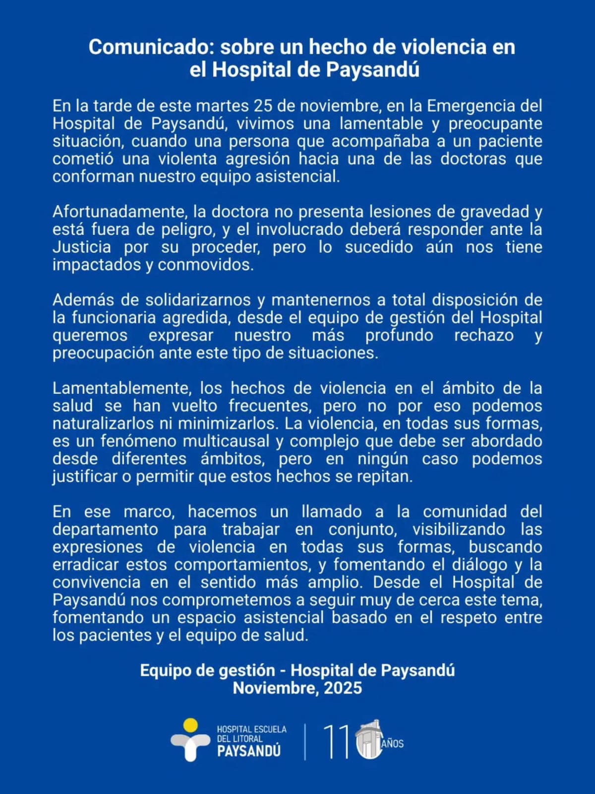 Una persona que acompañó a un paciente al Hospital de Paysandú protagonizó una "violenta agresión" hacia una de las doctoras lo que generó el "profundo rechazo" de parte de las autoridades del centro médico.