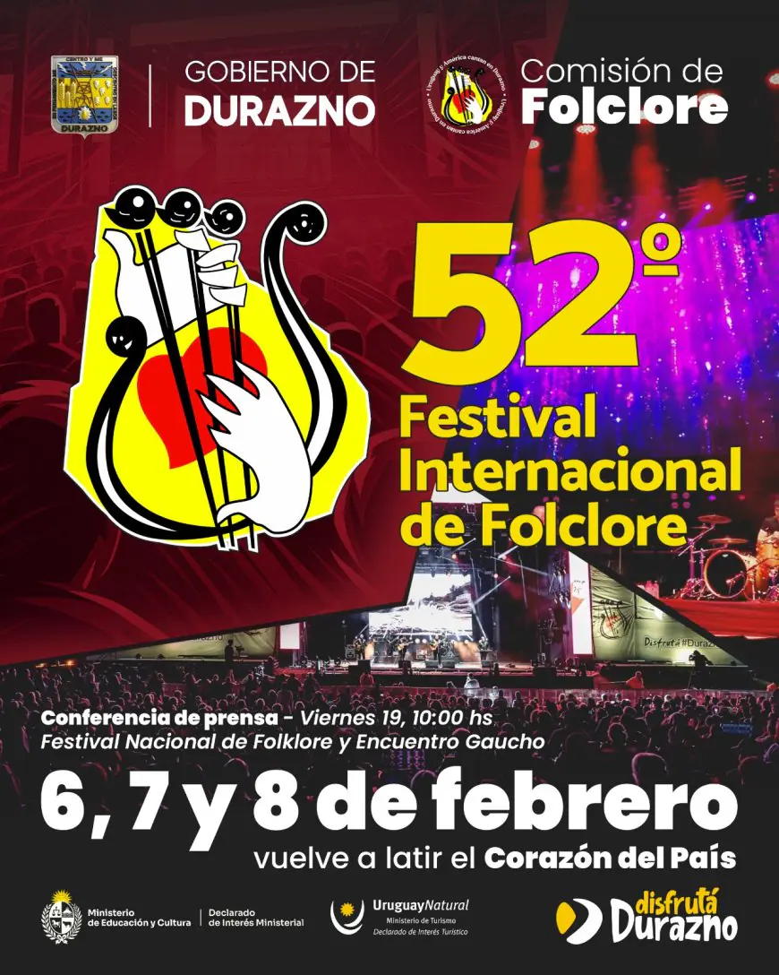 El Gobierno de Durazno realizará este viernes una conferencia de prensa en la que se presentarán los detalles de la 52ª edición del Festival Nacional de Folclore y del 25º Encuentro Gaucho, dos de los principales eventos tradicionales del departamento.