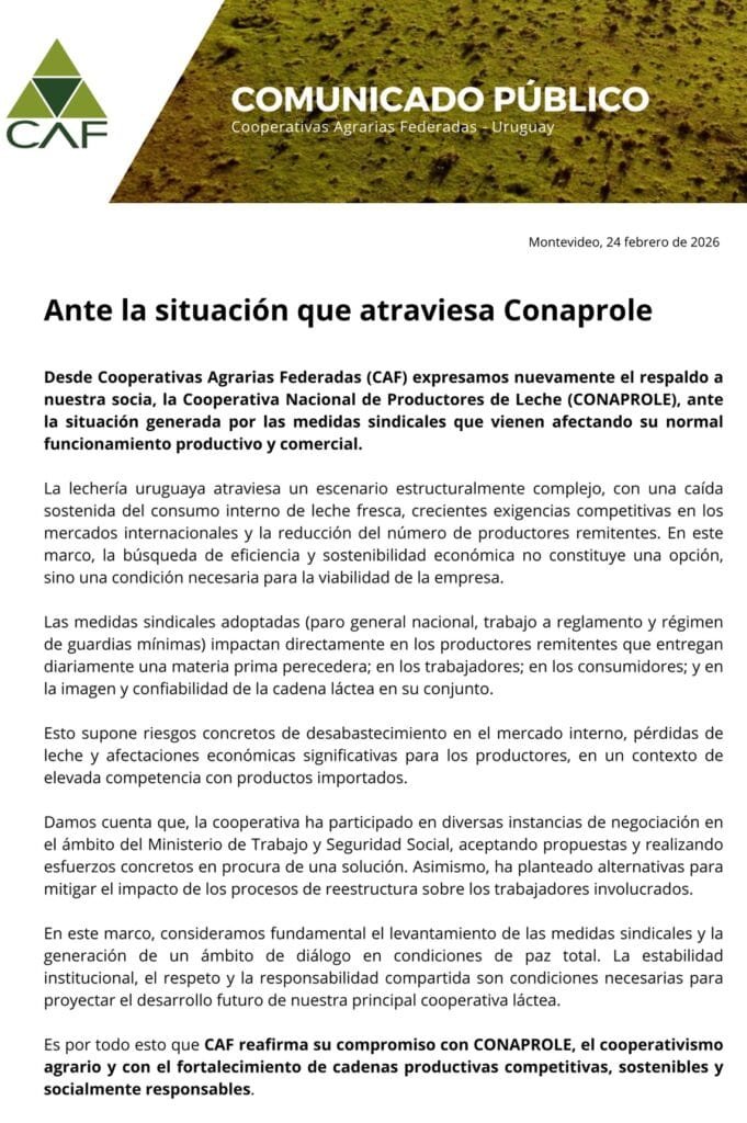 “Las medidas sindicales están afectando el normal funcionamiento productivo y comercial” de la empresa. Montevideo | Todo El Campo | Cooperativas Agrarias Federadas (CAF) expresó su respaldo explícito a Conaprole, cooperativa socia de la institución, y consideró que “las medidas sindicales están afectando su normal funcionamiento productivo y comercial”. En el comunicado difundido este martes 24, la institución que representa al cooperativismo agrario en nuestro país, observó que “la lechería uruguaya atraviesa un escenario estructuralmente complejo, con una caída sostenida del consumo interno de leche fresca, crecientes exigencias competitivas en los mercados internacionales y la reducción del número de productores remitentes”. “La búsqueda de eficiencia y sostenibilidad económica no constituye una opción, sino una conducción necesaria para la viabilidad de la empresa”, agrega el texto. Sin embargo, el sindicato de la empresa toma medidas que “impactas directamente en los productores remitentes que entregan diariamente una materia prima perecedera”; también golpea a “los trabajadores, los consumidores y en la imagen y confiabilidad” de toda la cadena láctea. Esas medidas sindicales son paros, trabajo a reglamento y guardias mínimas. El resultado es “riesgo de desabastecimiento en el mercado interno, pérdida de leche y afectaciones económicas significativas para los productores”. CAF considera que […]