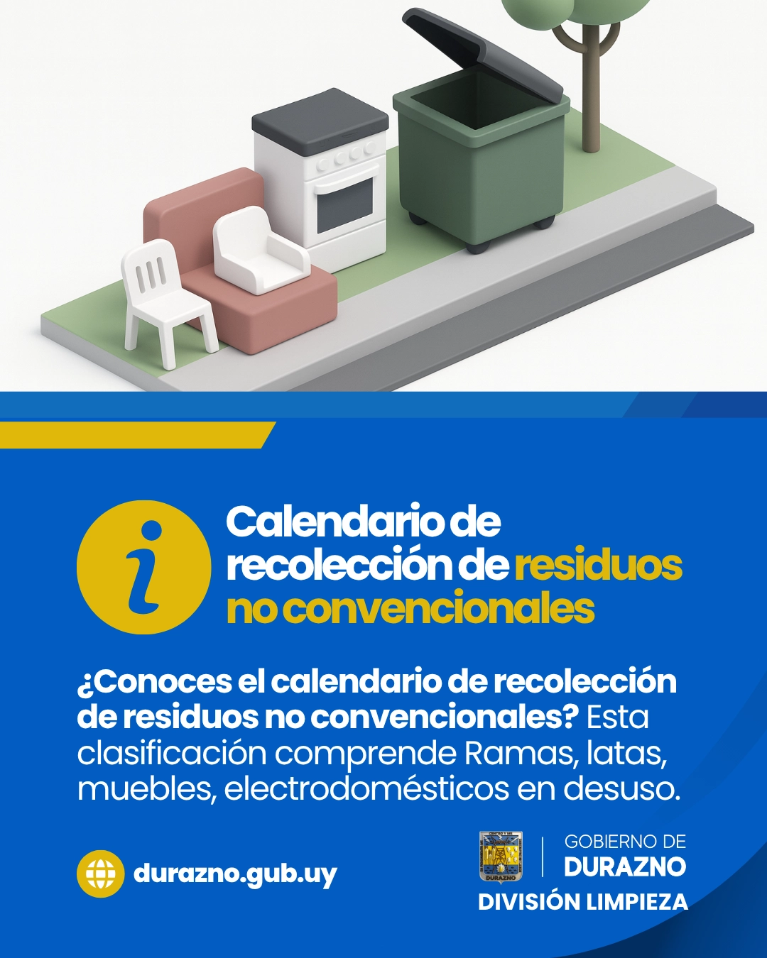 El Gobierno Departamental de Durazno, a través de la División Limpieza del Departamento de Servicios y en coordinación con los Centros de Integración Barrial (CIB), recuerda a la población el calendario vigente para la recolección de residuos no convencionales.