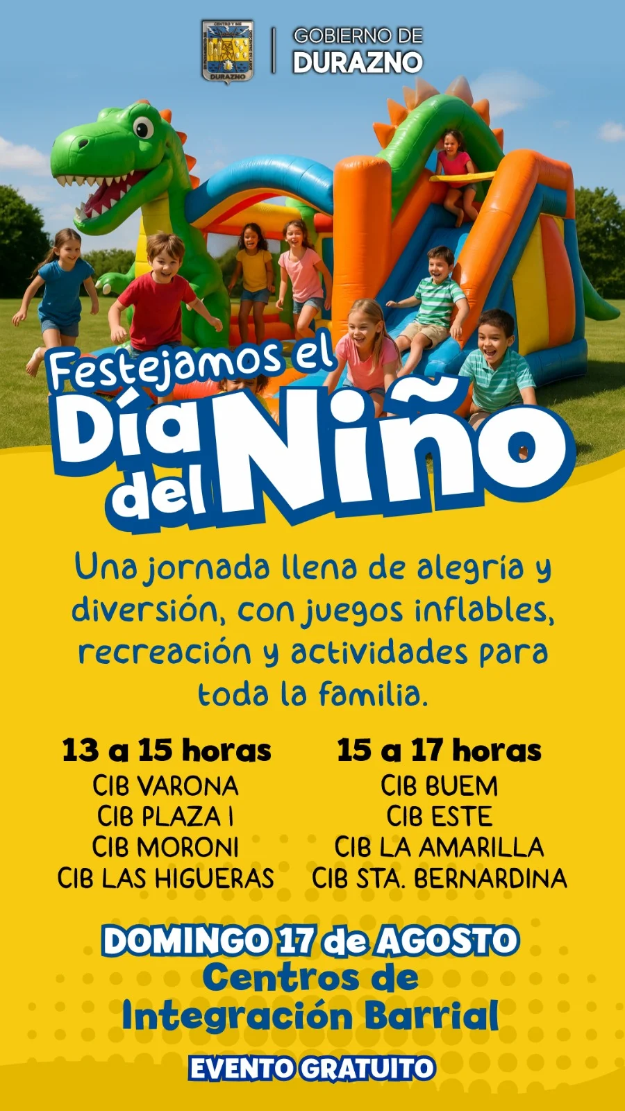 Este domingo 17 de agosto, el Gobierno Departamental de Durazno invita a las familias a vivir una tarde llena de alegría en los Centros de Integración Barrial (CIB) de la ciudad, en el marco de los festejos por el Día del Niño.