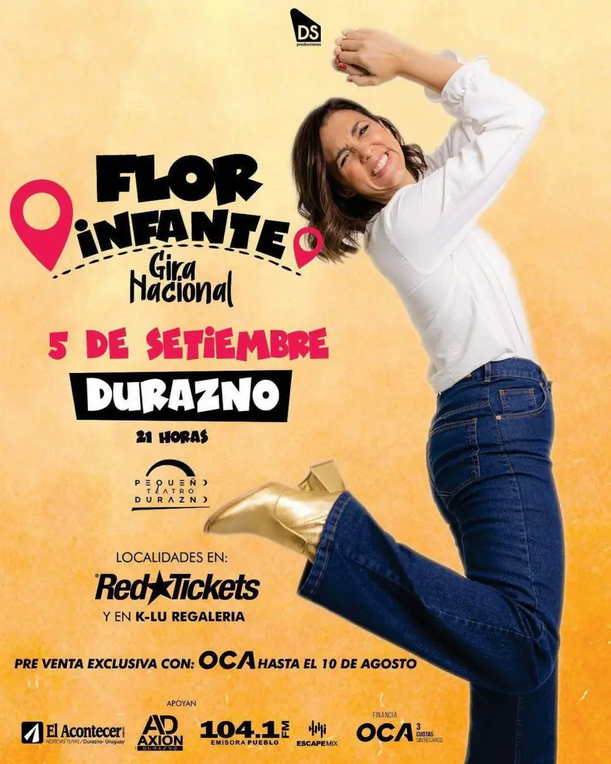 El próximo viernes 5 de setiembre, a las 21:00 horas, la reconocida comediante Flor Infante presentará su show unipersonal en el Pequeño Teatro de Durazno, como parte de una gira nacional que promete recorrer decenas de destinos y arrancar miles de risas.