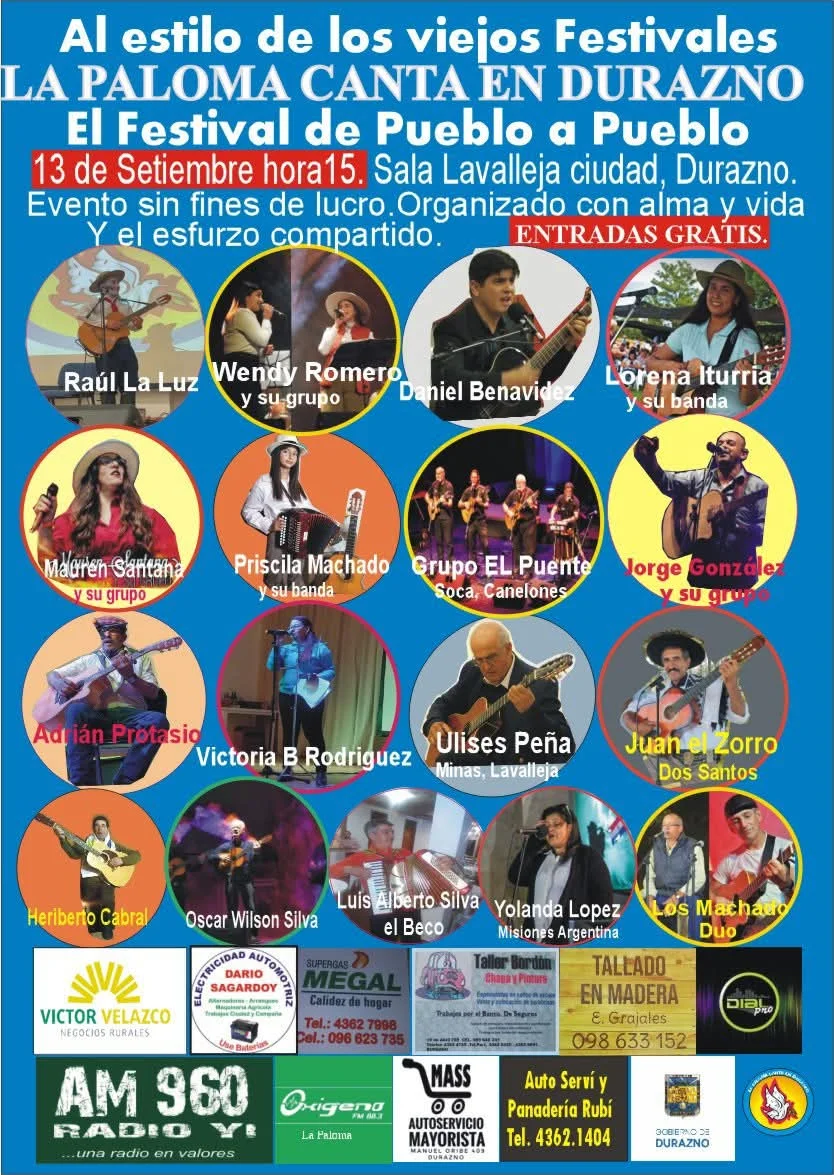 El sábado 13 de septiembre, la Sala Lavalleja de Durazno será escenario de una nueva edición del festival “La Paloma Canta en Durazno”, una propuesta cultural nacida de la iniciativa de Óscar Toranza junto a vecinos de La Paloma (séptima sección del departamento).
