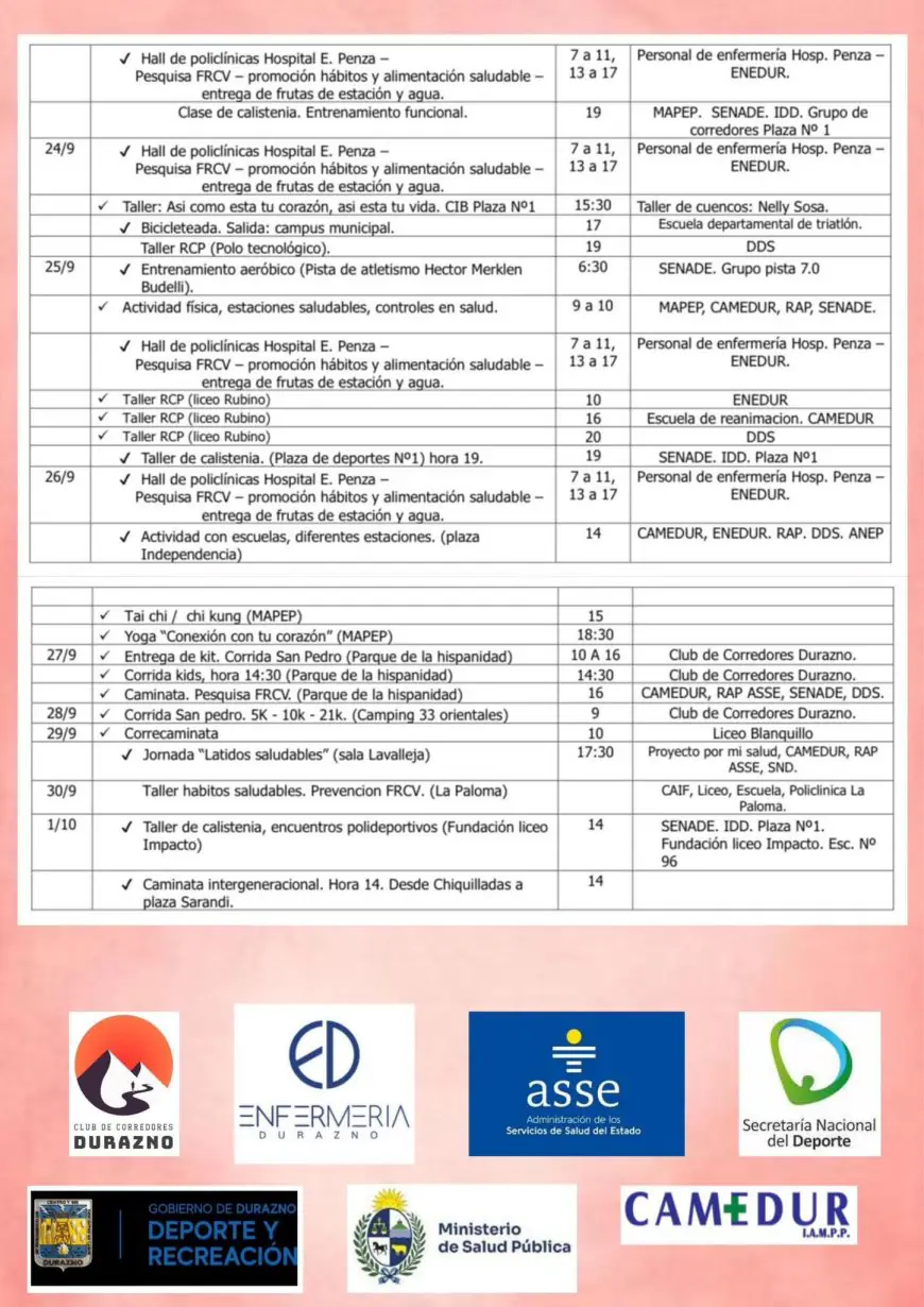 La iniciativa es organizada de forma conjunta por Camedur, ASSE, RAP, la Secretaría Nacional del Deporte, la Intendencia de Durazno y el Ministerio de Salud Pública, con el apoyo de instituciones educativas, deportivas y comunitarias del departamento.