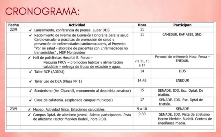Del 22 al 29 de setiembre de 2025 se desarrollará en Durazno la Semana del Corazón, una propuesta interinstitucional que busca promover hábitos saludables, la prevención de enfermedades cardiovasculares y la práctica de la actividad física en todas las edades.