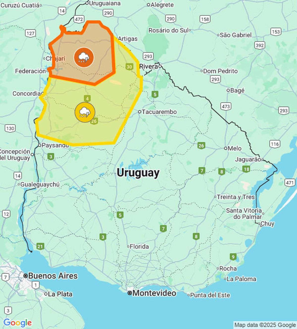 El Instituto Uruguayo de Meteorología (Inumet) publicó a la hora 14 una doble advertencia naranja y amarilla por tormentas fuertes y otras puntualmente fuertes. La advertencia naranja es para el extremo norte del país, casi todo Artigas, mientras que la amarilla abarca Salto y Paysandú, (ver mapa abajo).