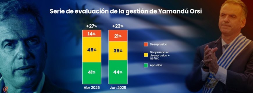 La evaluación de Yamandú Orsi como presidente de la República mantiene saldo positivo. Al finalizar junio, 44% de los uruguayos aprueba su gestión y 21% la desaprueba, conformando un saldo positivo de +23, según la encuesta de Equipos Consultores.