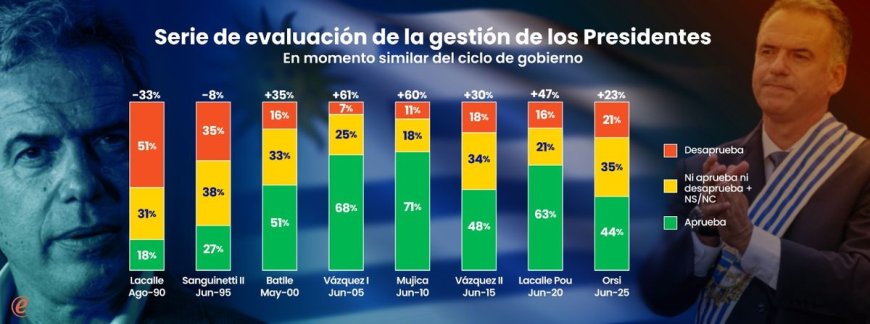 La evaluación es similar a la de Tabaré Vázquez en junio de 2015. En comparación histórica con otros presidentes a la misma altura, Orsi está a mitad de camino entre los tres presidentes de mejor evaluación (Vázquez 2005, Mujica 2010 y Lacalle Pou 2020), y los peor evaluados (Lacalle Herrera 1990 y Sanguinetti 1995), similar a Vázquez en junio de 2015 (aunque este último caería abruptamente a partir de agosto de ese año).